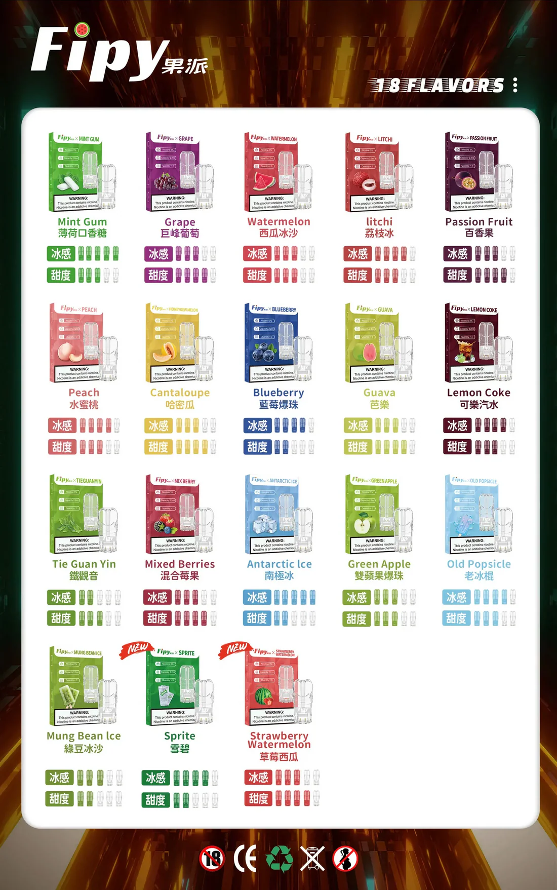 • 口味選擇:西瓜、葡萄、蜜桃、荔枝、青檸可樂等18種