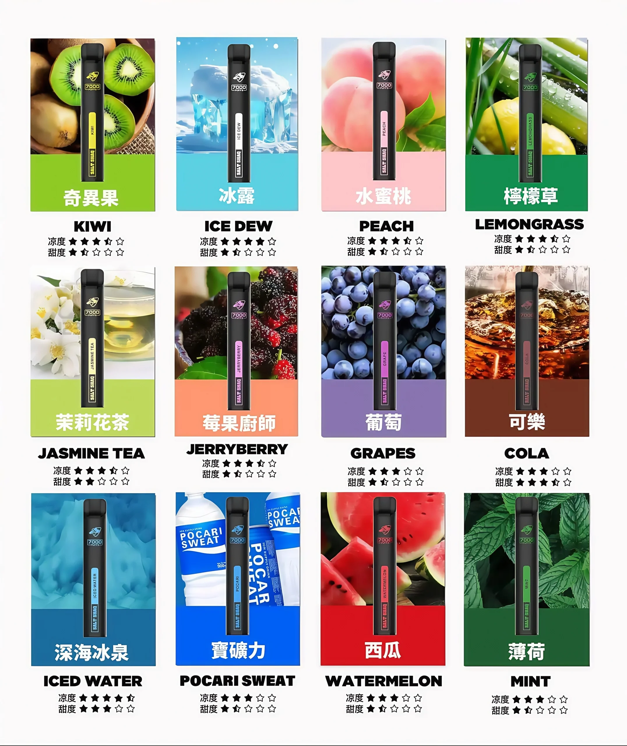 薄荷, 冰露, 葡萄, 可樂, 西瓜, 奇異果, 水蜜桃, 檸檬草, 寶礦力, 茉莉花茶, 莓果廚師, 深海礦泉